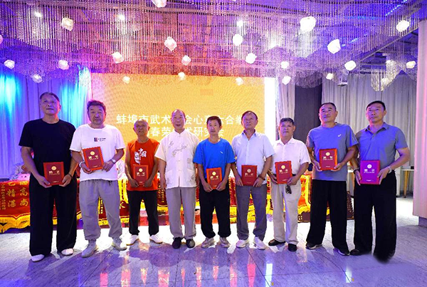 蚌埠市武术协会心意六合拳杨春荣拳术研究会会长杨宝全先生给受聘人员颁分证书并合影留念。